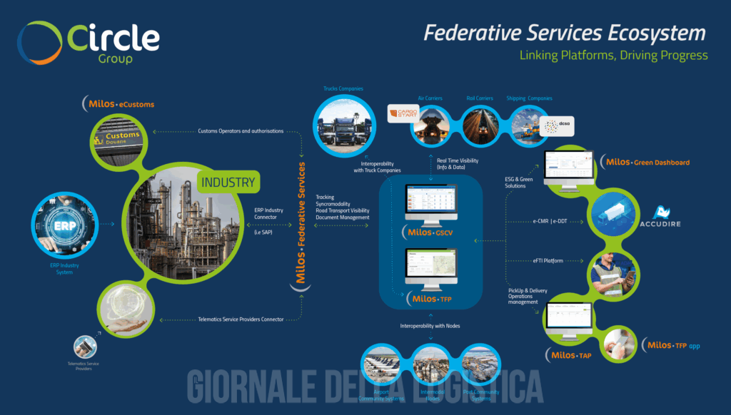 Sul fronte della tracciabilità e visibilità lungo la catena logistica, la piattaforma Milos GSCV – Global Supply Chain Visibility consente il monitoraggio end-to-end dei flussi, aggregando dati da fonti eterogenee (IoT, TOS, ERP, sistemi marittimi e aeroportuali) e restituendo una vista completa delle performance operative e ambientali, anche grazie alla Green Dashboard certificata ISO 14083:2023. La stessa piattaforma è in grado di generare indicatori ESG, report certificabili e strumenti di supporto alle strategie di sostenibilità aziendale. Connessa al mondo dell’industria c’è la soluzione MasterSped — la suite digitale sviluppata dal Gruppo Circle per spedizionieri, operatori doganali e trasportatori — che nasce con l’obiettivo di facilitare l’operatività e ottimizzare i flussi logistici, per tutte le principali modalità di trasporto, stradale, ferroviario, aereo e marittimo, oltre a gestire in modo efficiente gli aspetti doganali e finanziari.